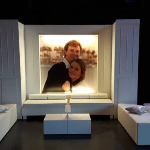Onze Ganesha Lounge bestaande uit witte wanden met verlichte prints, wit zitmeubilair met bijpassende gekleurde kussens en hoge statafels met bedrukte tafelbladen in hennamotief. Deze tafelbladen worden volledig op maat gemaakt met de print of logo van het event bedrukt op een mdf blad en afgewerkte randen naar wens. We creëren die Oosterse touch dmv Boedhabeelden, reuze kandelaars, fleurige kussens en doeken.